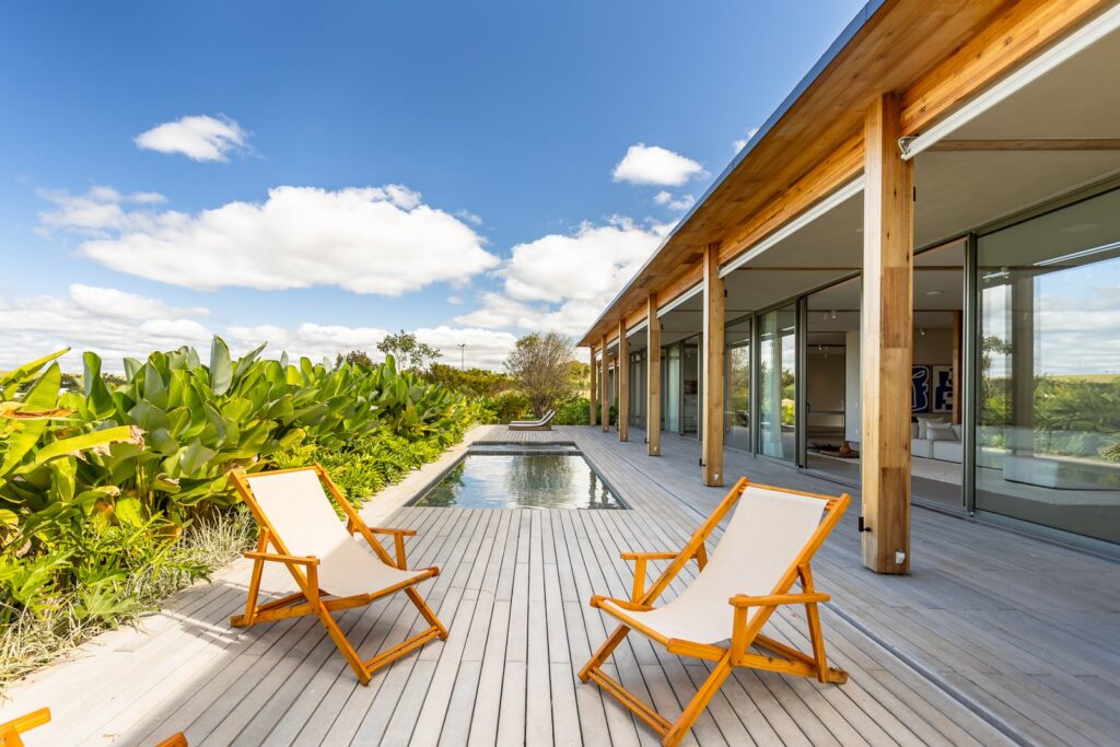 Nas casas projetadas por arquitetos renomados como Isay Weinfeld, Gui Mattos ou Márcio Kogan, há uma linguagem comum: a dissolução das fronteiras entre o interior e o exterior. Paredes de vidro que se abrem completamente, varandas que se estendem em decks flutuantes, jardins internos e o uso intenso de materiais naturais criam uma experiência de moradia fluida e sensorial. Uma sala de estar que se abre para um espelho d’água, uma suíte com vista para o campo de golfe ou uma cozinha integrada à área de lazer: a casa de campo de alto padrão é, antes de tudo, um convite ao tempo de qualidade.
