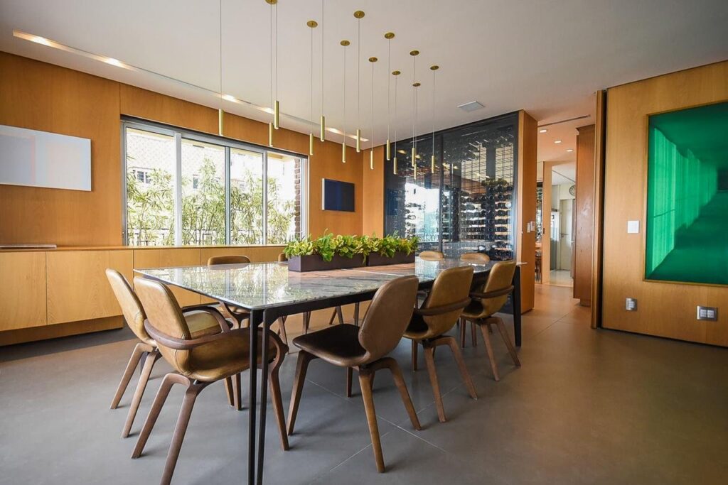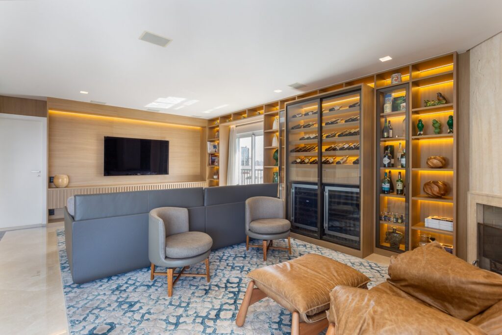 Neste apartamento no Jardim Paulista, há uma sala de adega com poltronas, criando o ambiente perfeito para a degustação de vinhos. Além disso, o apartamento possui sala de estar com lareira, ampla varanda com jardim e vista panorâmica, lounge e sala de cinema.