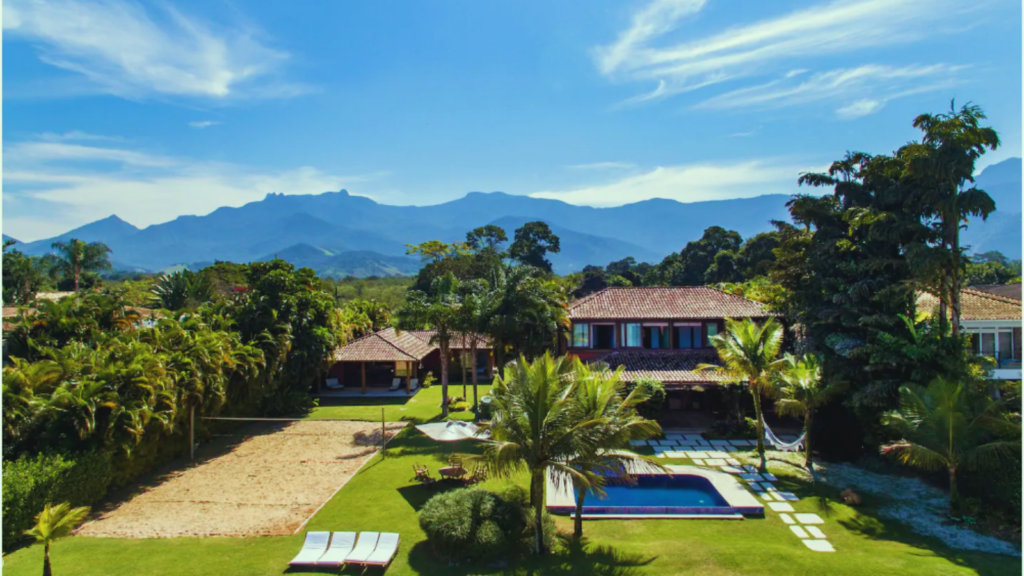 Casa em Angra dos Reis com área de lazer completa, incluindo piscina, sauna, quadras de tênis e vôlei, salão de jogos, jardim e deck privativo