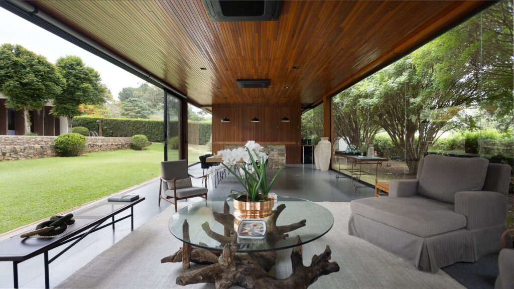 O projeto destaca principalmente o contato constante com a natureza local da Fazenda Boa Vista. Localizada na Villa Fasano do Tênis — assim denominada por sua proximidade às quadras de tênis do condomínio —, a casa se destaca pelo uso de materiais naturais, como pedras rústicas e madeira, que trazem textura e acolhimento aos espaços. Com uma concepção voltada ao lazer e ao bem-estar, o arquiteto projetou ambientes amplos e integrados, incluindo um home theater, academia, sauna, espaço gourmet e uma generosa piscina, que convida à contemplação e ao convívio.