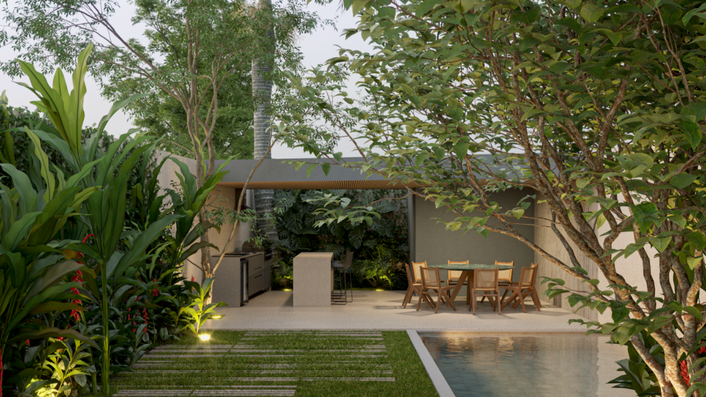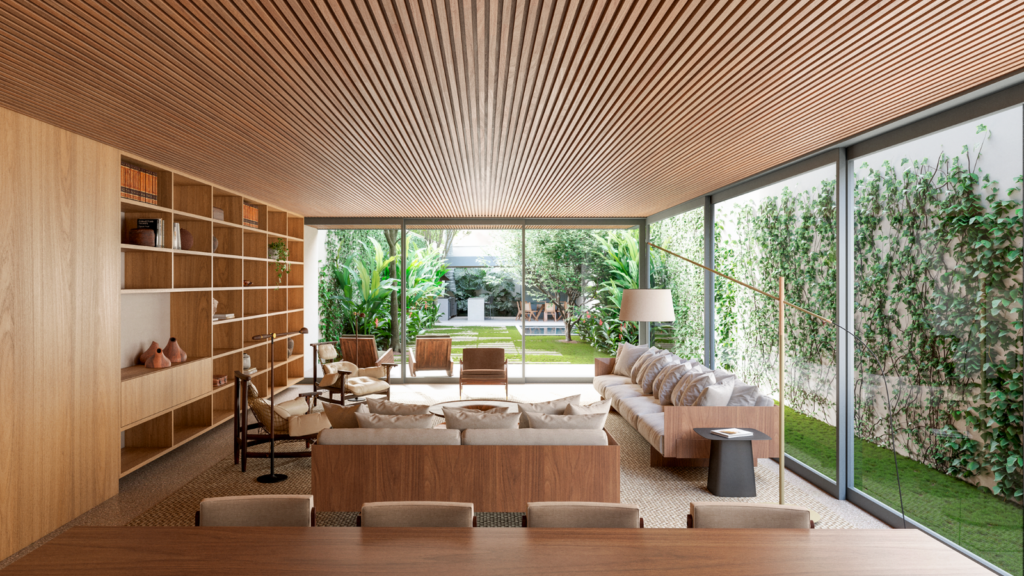 Com projeto arquitetônico assinado por Fernanda Neiva e Ana Terra Capobianco, a casa combina contemporaneidade e elegância em cada traço. A fachada ventilada, o uso de vegetação densa e formada — com espécies como pinheiros e jabuticabeiras — e o cuidado com a ventilação natural e o isolamento acústico revelam uma atenção meticulosa ao bem-estar e à integração com a natureza. Tudo isso reforça a proposta de um viver urbano mais leve, exclusivo e conectado ao entorno.