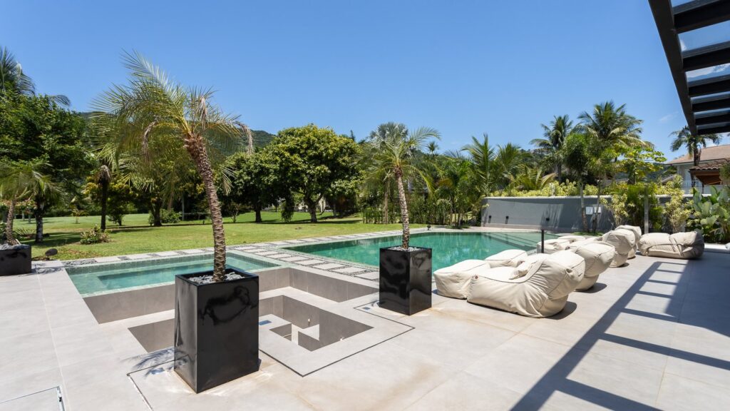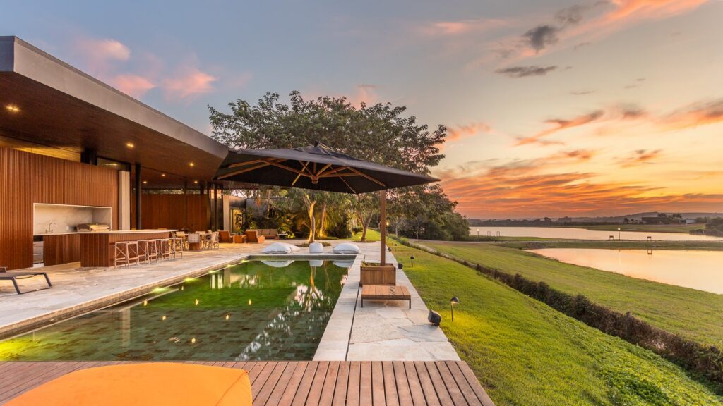 Pensada para proporcionar conforto em todas as estações, a casa se destaca no outono com ambientes que valorizam o convívio e o lazer ao ar livre. A área externa é um verdadeiro paraíso particular, com piscina estilo cristal pool de 120 m² com cascata, deck em madeira, spa e sauna úmida — perfeitos para relaxar nas tardes amenas da estação. À noite, a praça de fogo e o telão de LED criam o cenário ideal para encontros memoráveis.