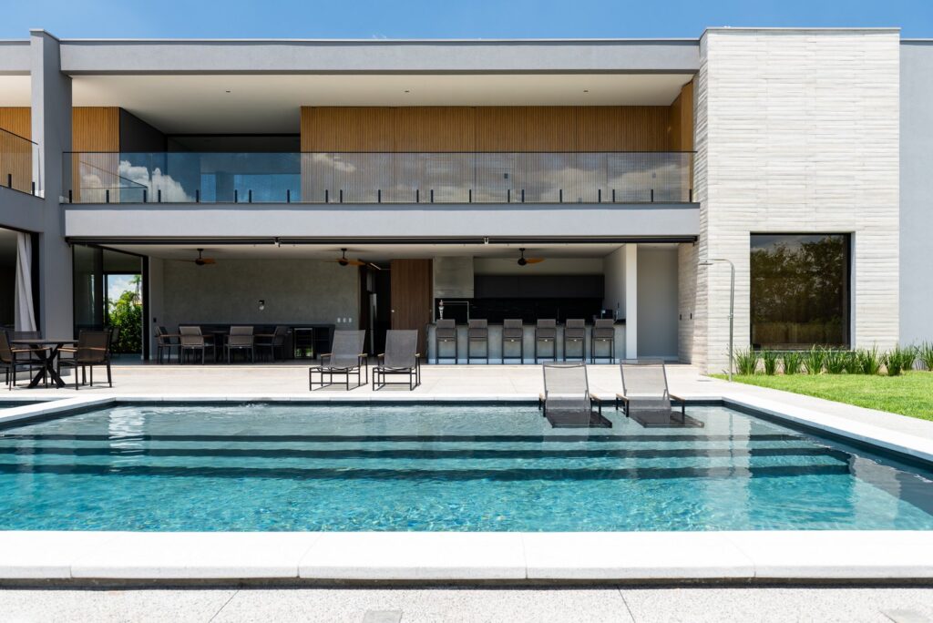 A integração com a paisagem natural é outro aspecto central em projetos de alto padrão. Chaguri explica: “O terreno e sua paisagem não são apenas pano de fundo, mas elementos centrais da concepção arquitetônica. Projetos de alto padrão respeitam o relevo natural, priorizam vistas privilegiadas e utilizam materiais que harmonizam com o ambiente. Varandas amplas, decks, espelhos d’água e iluminação estratégica prolongam a experiência entre interior e exterior.”