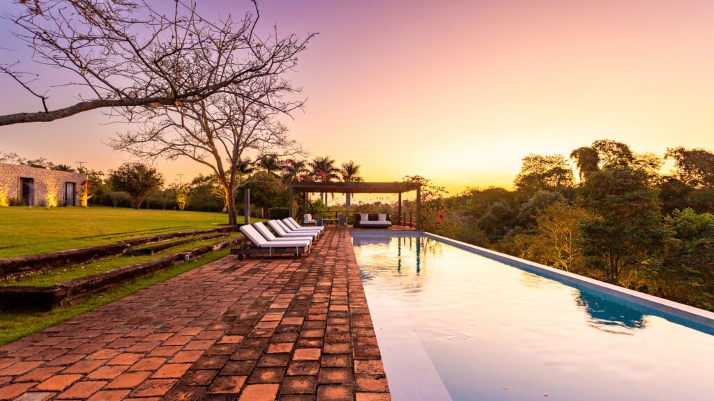 A área de lazer é um dos grandes atrativos do projeto, com uma piscina envolta por um extenso gramado e acompanhada por uma sauna que valoriza o bem-estar. O paisagismo reforça a sensação de refúgio, permitindo que a residência se funda ao cenário natural de forma leve e elegante. O living externo e as varandas funcionam como verdadeiros mirantes, voltados para a vista desobstruída da mata nativa.